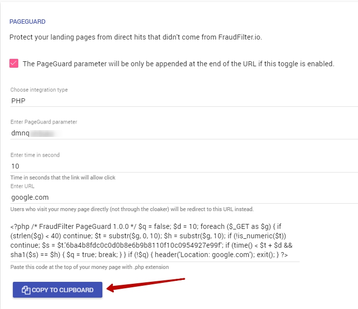 When PageGuard is enabled and a visitor hits your campaign, fraudfilter generates and sends a special randomized time-based parameter to your landing page. The parameter is not identifiable or footprintable and can be customized.