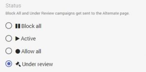 Important Submit your campaign for approval in Under review state! Once approved, switch the campaign to Active. Reviewers will always see the safe page and real visitors will always see the money page.